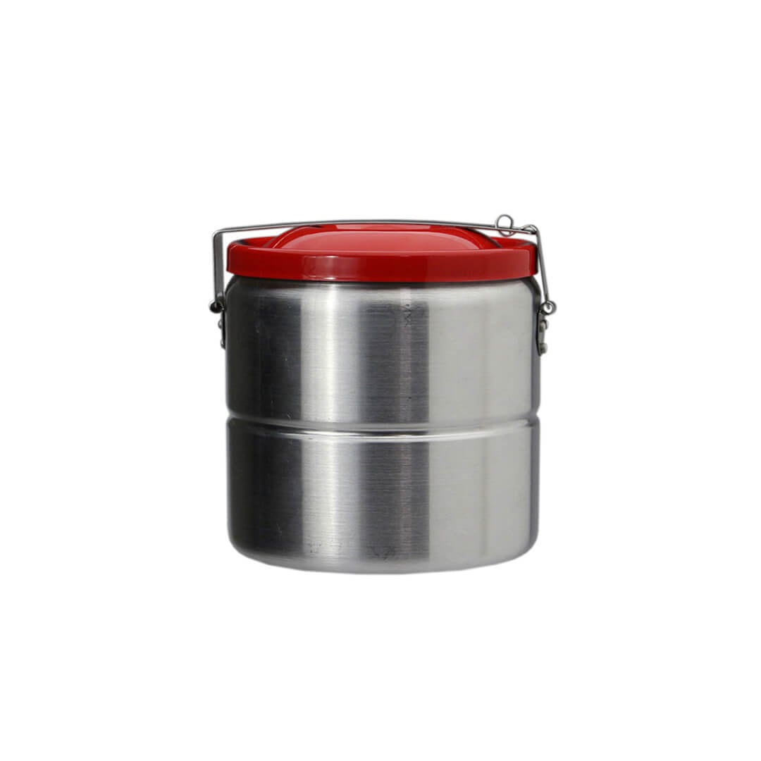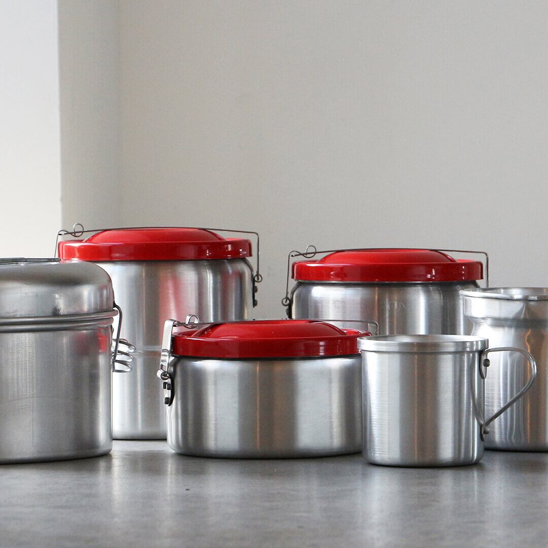 鮮やかな赤い蓋が印象的なアルミ製キャニスター。食材を中に入れて持ち運び、外でその