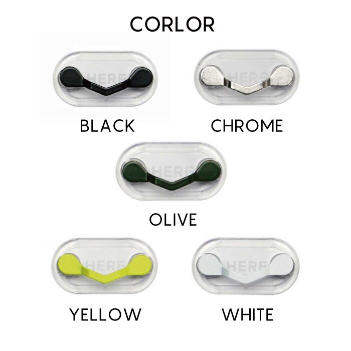 フックのカラーは、イエロー・ホワイト・ブラック・オリーブ・クローム(シルバー)の5色展開。合わせる洋服に合わせて複数持っておくのもおすすめ。