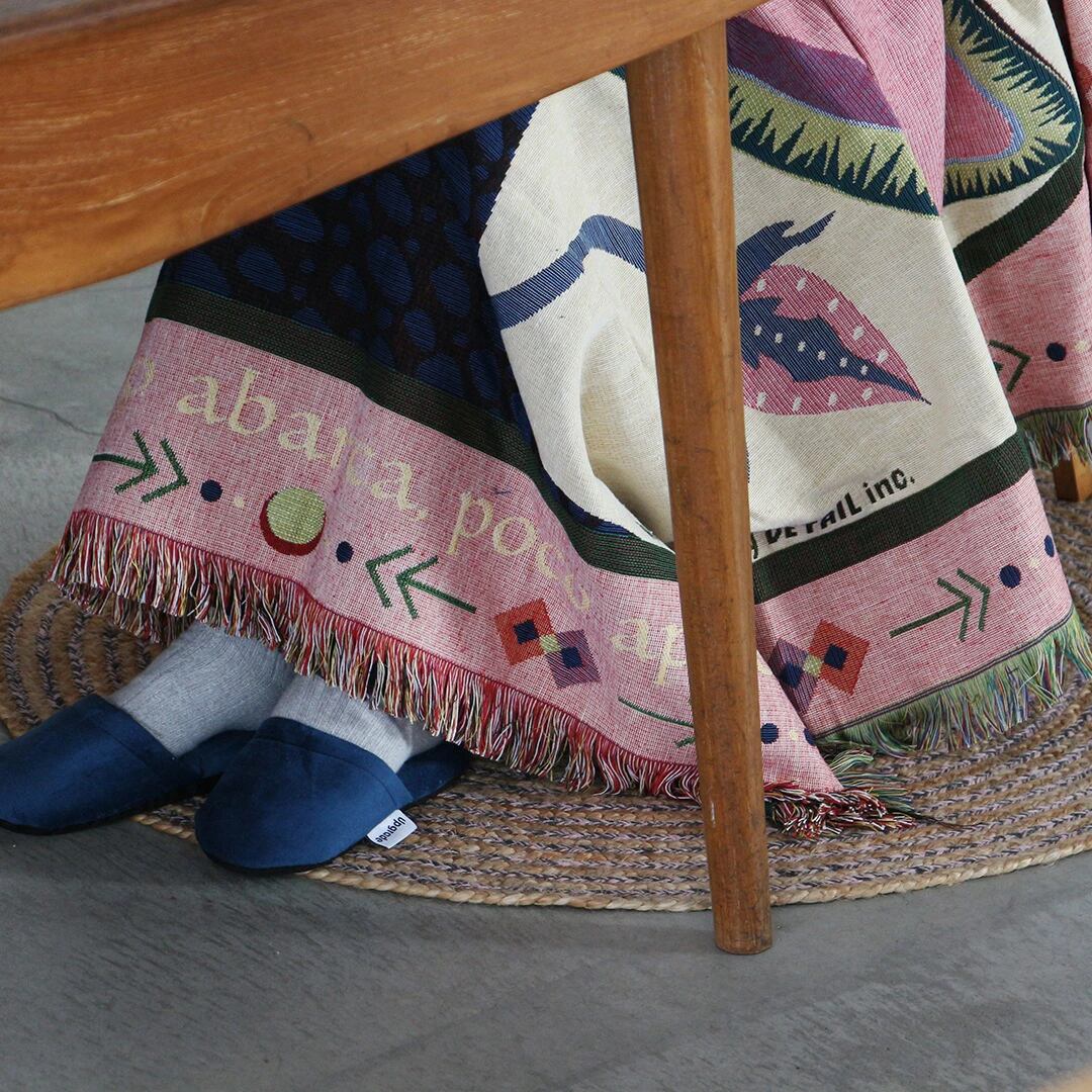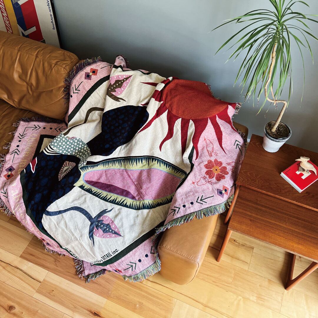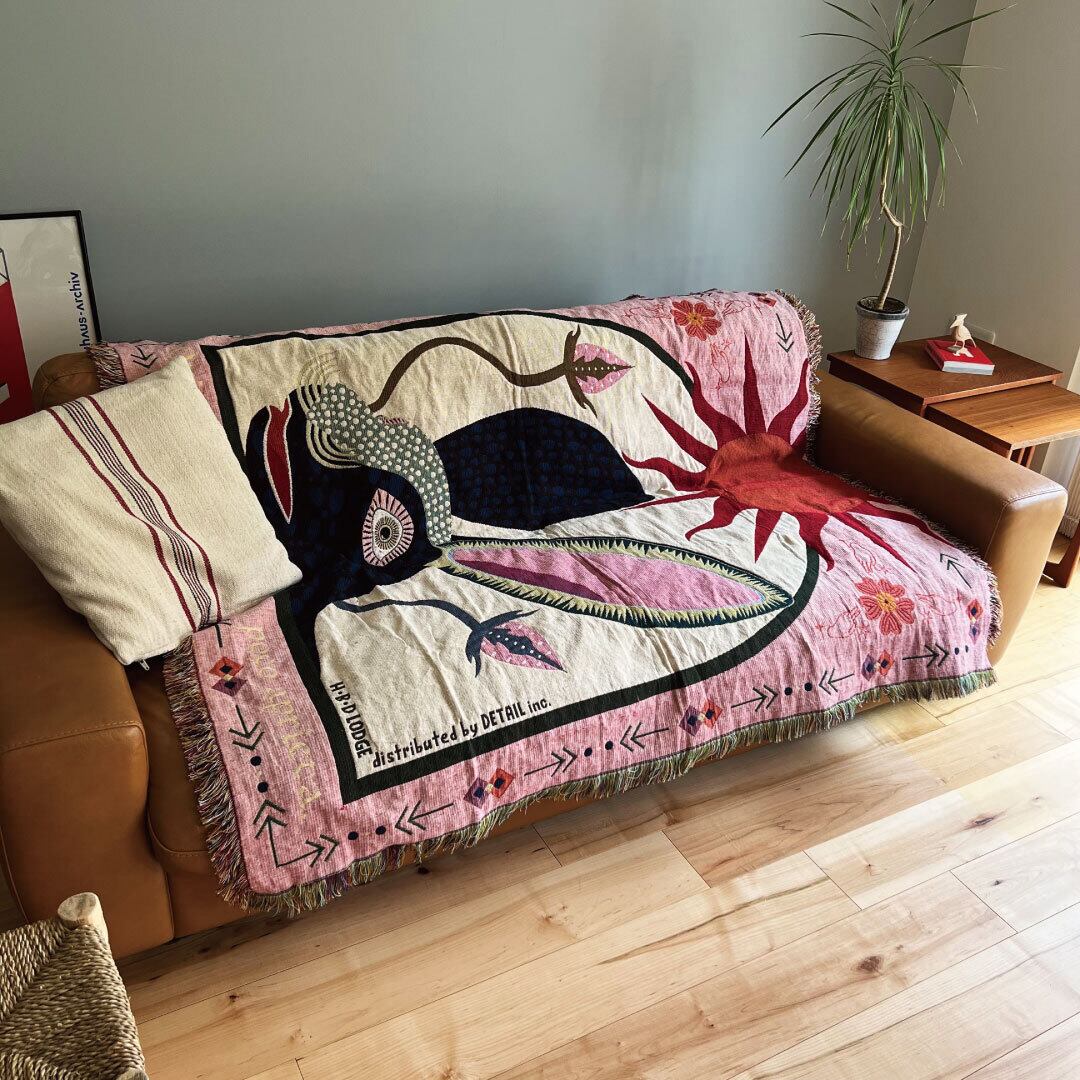 ソファやベッドにサラッと掛けて、膝掛けとして、鮮やかな色合いをいかしてアートとして壁面への装飾として斬新な使い方など様々にお部屋を彩ります。