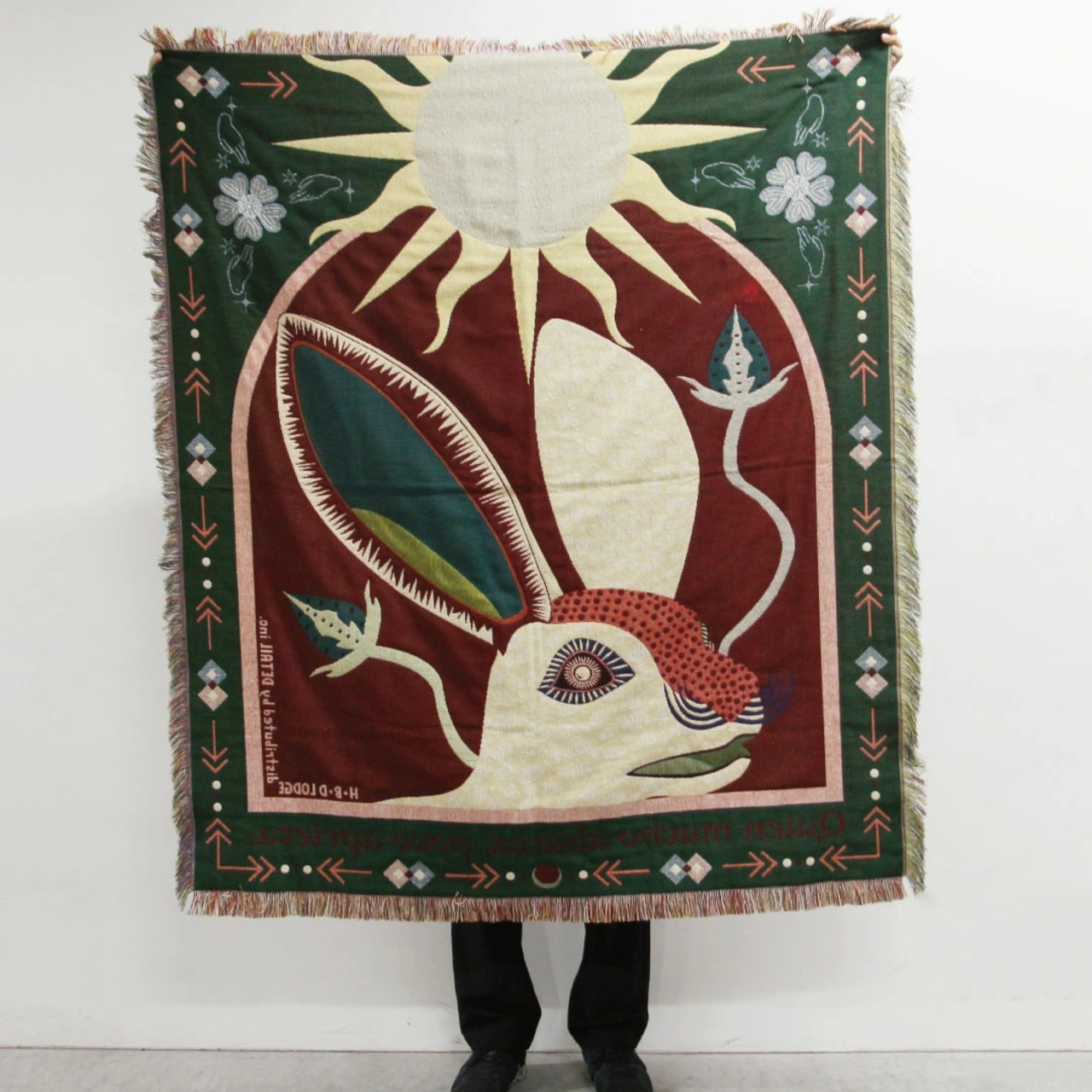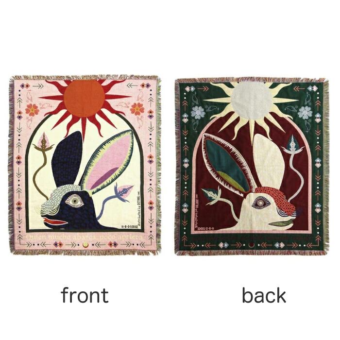 メキシコ・オアハカ(Oaxaca)の民藝・ウッドカービングをモチーフにデザインされたスローケット。光り輝くメキシコの太陽のもと、自由に跳び回る2023年の干支・兎が描かれています。